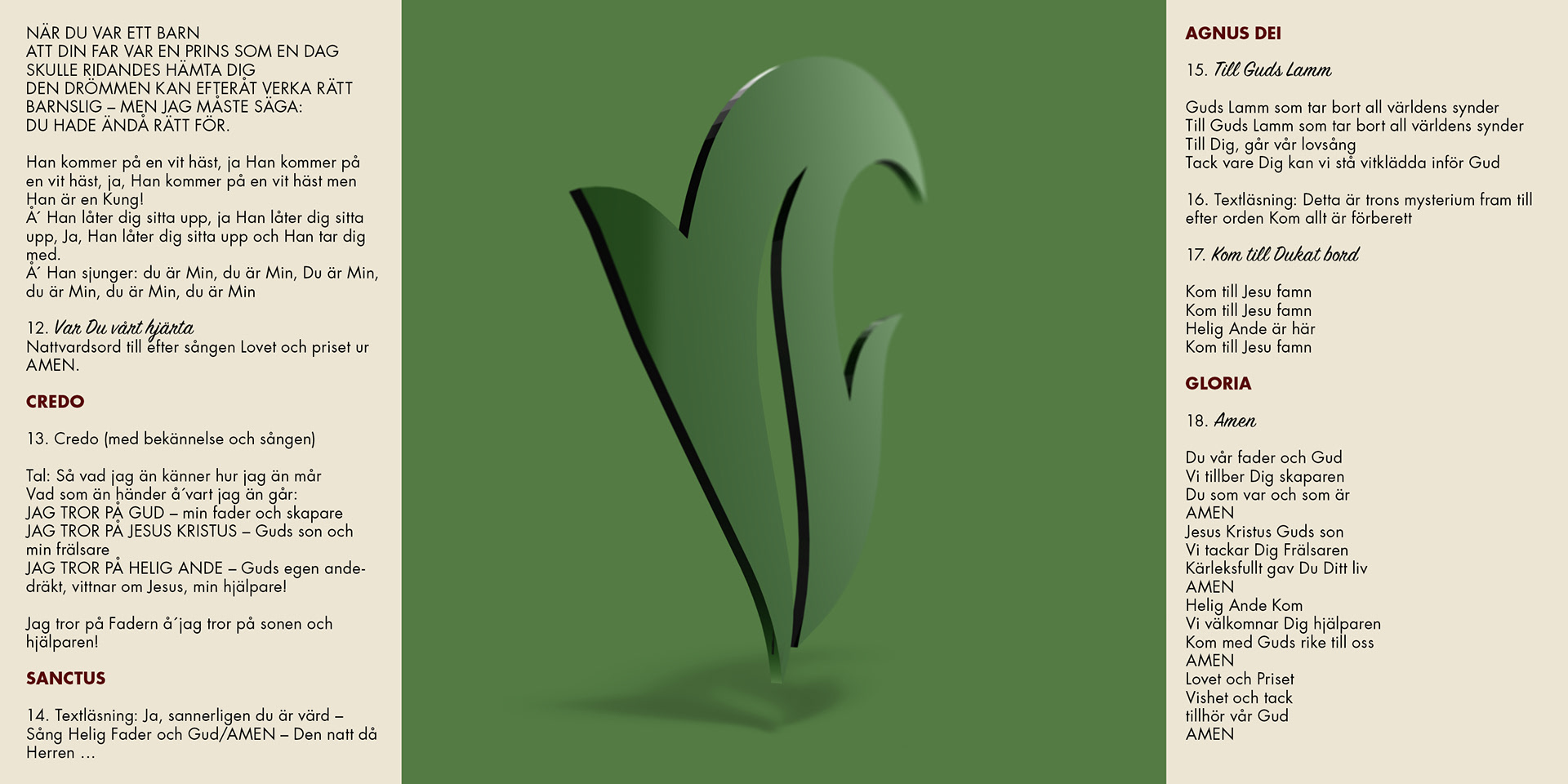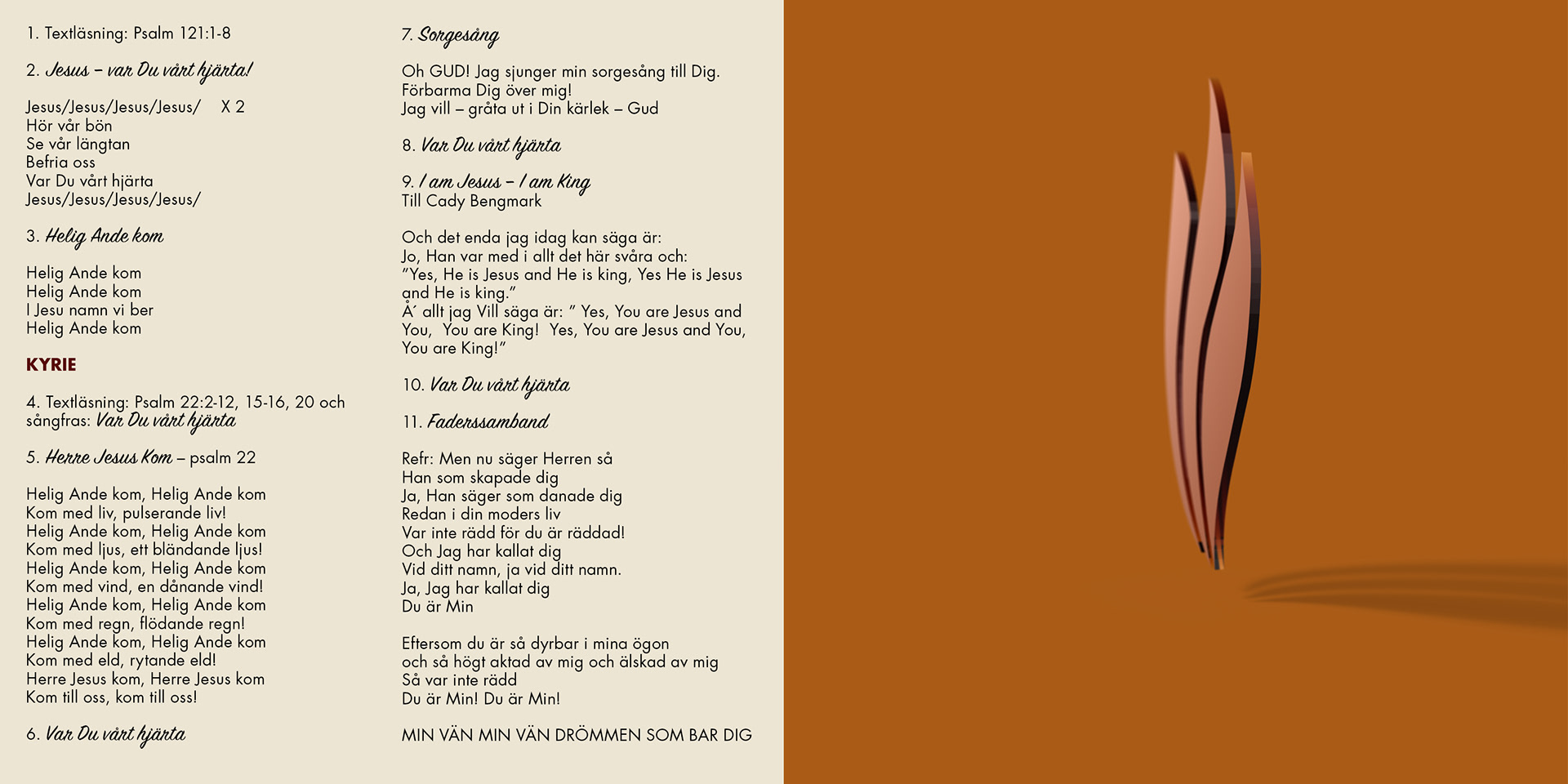 Lågan, växten och kärleken. Symbolerna renderade i glas för att visa skörheten. Alla tre filtrerar med sin färg olika delar av skaparen.